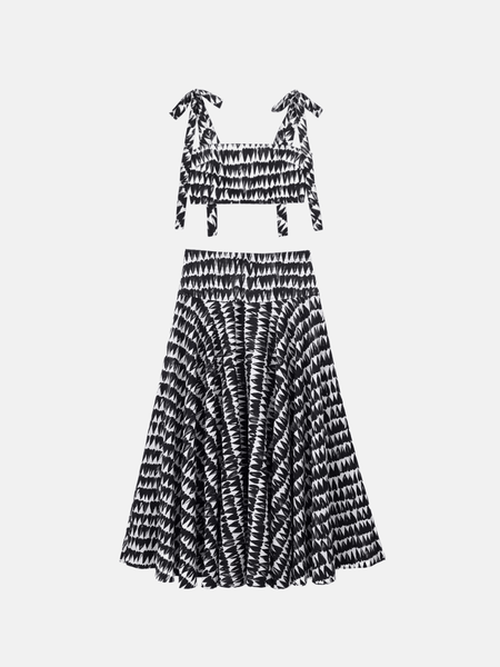 Perfeito para os dias ensolarados de verão. Composto por uma saia branca com caimento leve e um top combinando, a peça traz um charme especial com sua estampa de corações pretos, unindo modernismo e estilo.