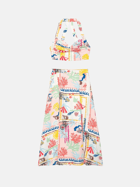 Perfeito para mulheres que buscam um visual leve, moderno e prático para os dias de sol. Com uma estampa encantadora de praia com guarda-sóis, esta peça traz a energia descontraída e sofisticada do verão em cada detalhe.